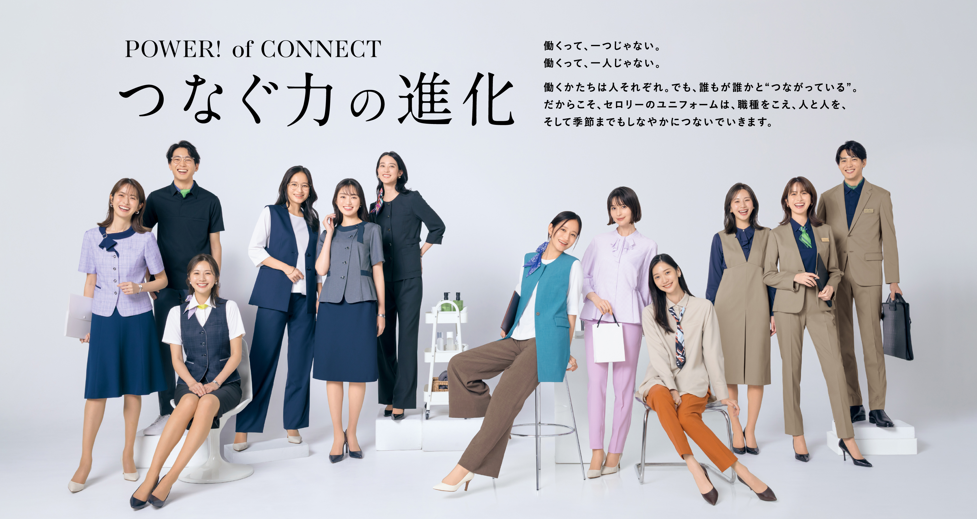 AUTUMN & WINTERユニフォームの「伝える力」の変化を、新たな進化へ。 セロリーらしい存在感と快適な着心地に、高性能な素材を採用し抗菌・抗ウイルス・制電を備え、毎日の働くをサポートします。